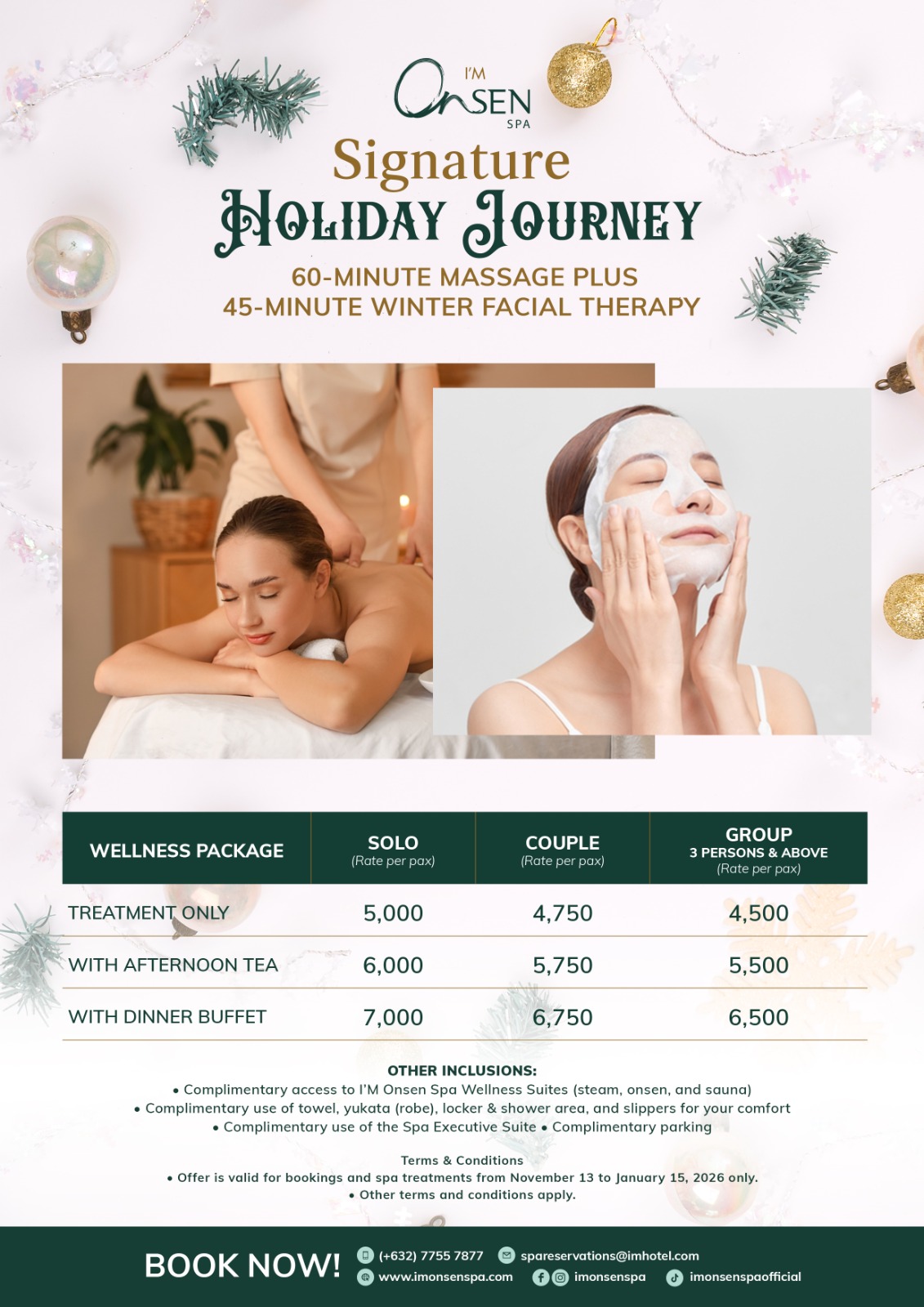 - Offer is valid for booking and spa treatment from November 11, 2025 to January 15, 2026 only.