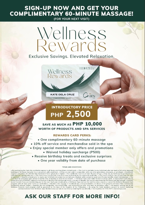 Indulge in relaxation and exclusive spa privileges with our Wellness Reward Card. Enjoy rewards and member perks worth up to Php 10,000+, plus special discounts and exclusive treatment benefits.